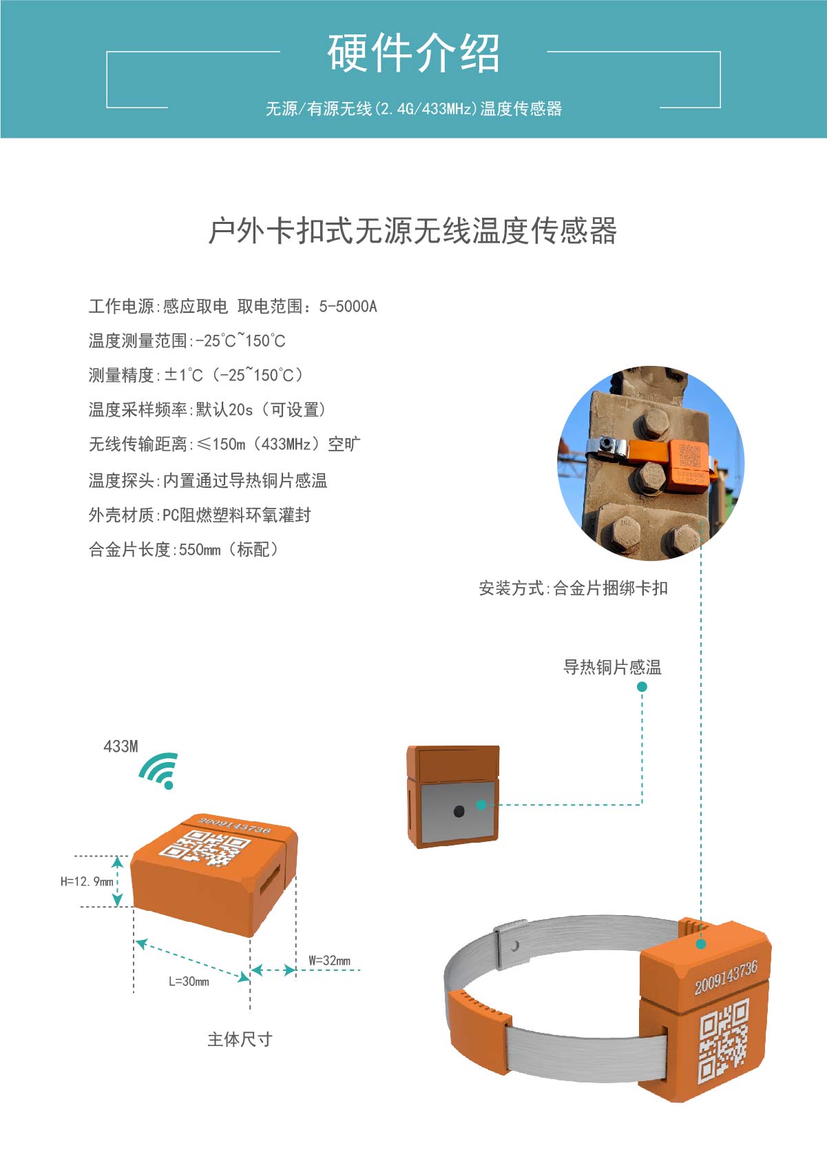 无线频率:无源 433M工作电源:感应取电 取电范围:5 ~ 5000A外形尺寸:30*32*12.9mm安装方式:合金片捆绑卡扣温度测量范围:-25~+150℃测温精度:±1℃(-25~150℃)温度采样频率:默认20S (可设置)无线传输距离:≤150米(433MHz)空旷外壳材质:PC阻燃塑料环氧灌封温度探头:内置通过导热铜片感温防水等级:IP68