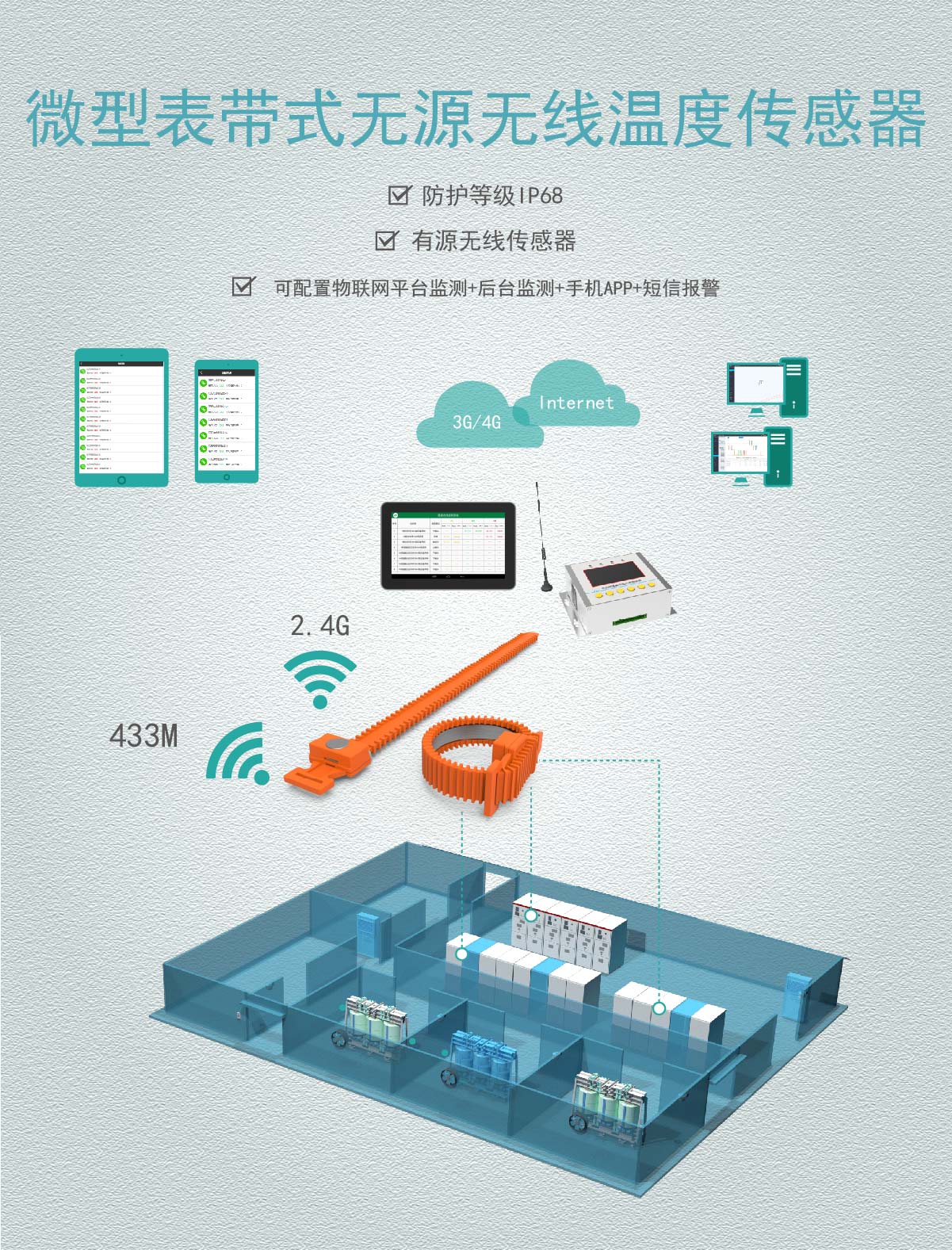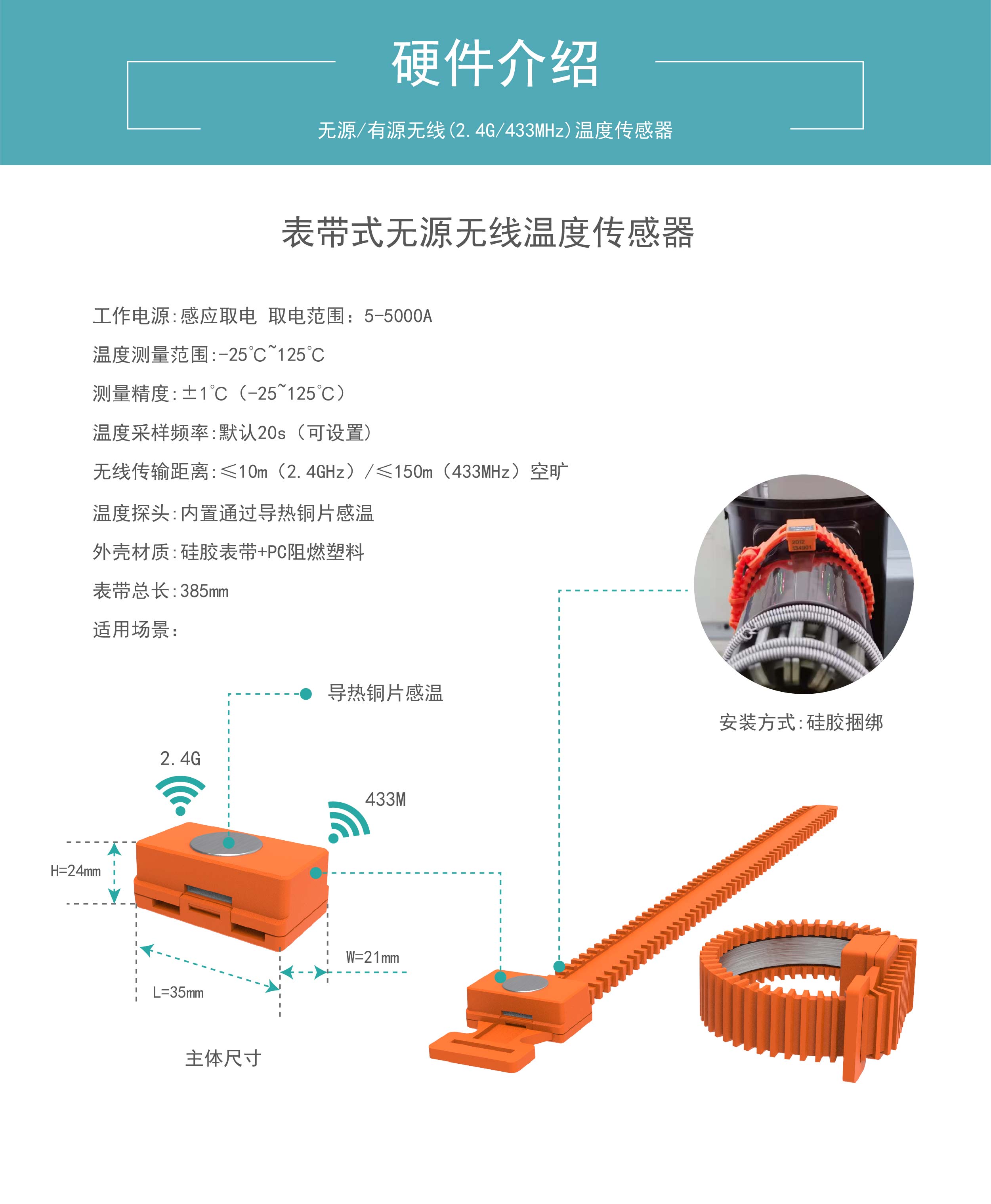 无线频率:无源2.4G /433M 可选工作电源:感应取电 取电范围:5 ~ 5000A外形尺寸:35*21*15mm表带总长385mm安装方式:硅胶捆绑温度测量范围:-25~+150℃测温精度:±1℃(-25~150℃)温度采样频率:默认20S (可设置)无线传输距离:≤10m(2.4GHz)/ ≤150m(433MHz)空旷外壳材质:PC阻燃塑料+硅胶绑带温度探头:内置通过导热铜片感温